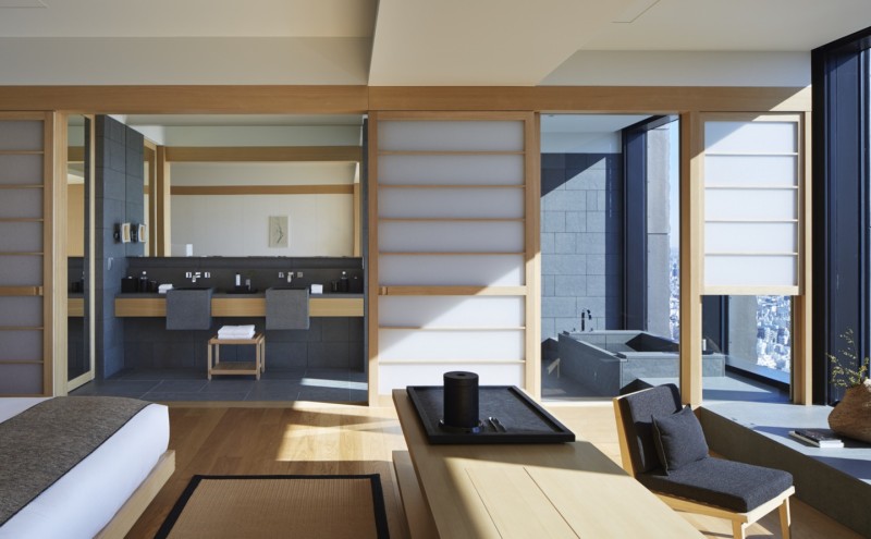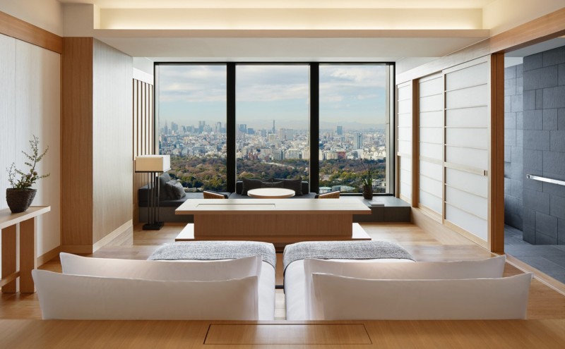 安縵东京高达 30 公尺的挑高中庭,灵感源自巨大的「和纸灯笼」,光影流转间尽显禪意。全馆仅有 84 间客房,每间房运用大量石材、木质,除了配备和纸拉门、榻榻米与石造 furo 浴缸(火山岩浴缸),还能透过大面积落地窗,将东京铁塔、皇居外苑甚至远方的富士山一览无遗,让东京天际线成为最奢华的背景装饰。