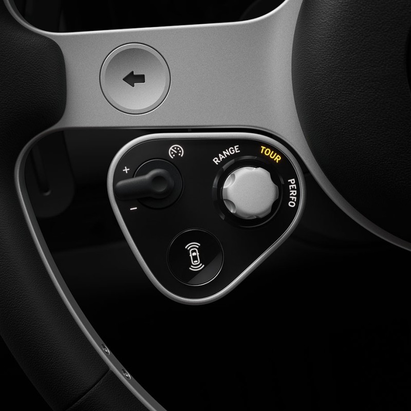 方向盘向 1950-60 年代的经典 Nardi 木质方向盘致敬,採用 19 个 CNC 零件组成,比标准法拉利方向盘轻 400 克。配备两组类比控制模组,按键的反馈感经过 20 多项评估测试。精密拨桿保留直升机与经典赛车的灵感,每一颗按键阻尼与声响都精准考量。