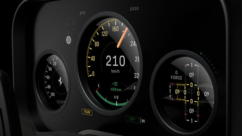 最令收藏家着迷的,莫过于中控显示器上方的「Multigraph」。这是一个结合了高级制表工艺与电子控制的装置,三根独立马达驱动的铝合金指针,可在时钟、计时码表、指南针与弹射起步(Launch Control)模式间切换,将精密机械的动态美感发挥到极致,向 Ferrari 的历史传承致敬,亦凸显品牌对激情与卓越的坚持。