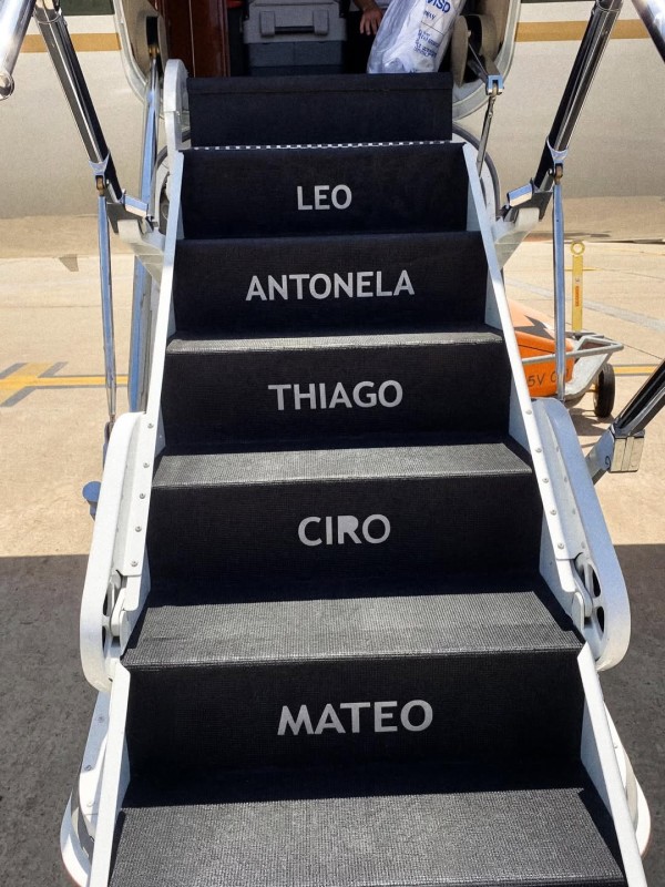 这架飞机最动人的细节,隐藏在收放式的登机阶梯上。每一级阶梯都刻有家人的名字——从最上层的 LEO(梅西的小名),到妻子 ANTONELA,以及三个儿子 THIAGO、CIRO 与 MATEO。这种定制化的设计,体现了梅西对于家庭的高度重视,让每一次启程与归途都充满爱的连结。