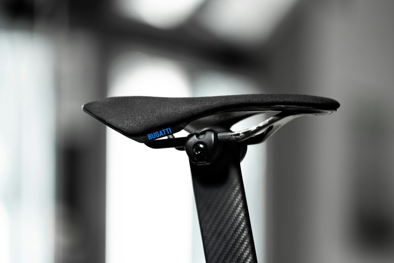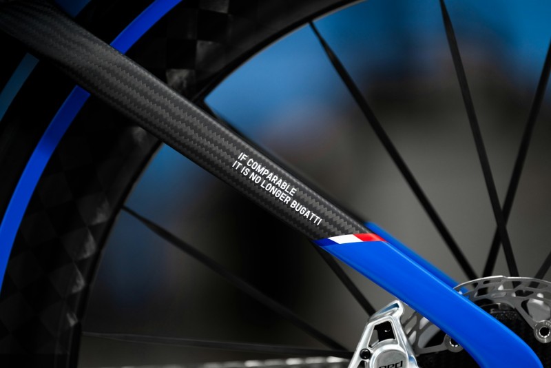 双方的合作深入零组件的研发层面,包括车座、煞车碟盘和牙盘、轮胎等多款客制化零件,皆为 Bugatti Factor ONE 专属打造。车架并非单一碳纤维层次,而是结合了三种高阶碳纤维:TeXtreme®(常用于 F1 赛车)、Toray®(航太级供应商)以及 Nippon Graphite®(日本石墨)。这种多层结构的设计,让车架在极致轻量化的同时,能承受极高的扭力而不变形。车身表面覆盖着精致的 3K 碳纤维编织纹路,这不仅是视觉上的奢华享受,更强化了结构的抗拉强度。每一次踩踏的动力都能毫无保留地传递到后轮,让骑乘者体验到如同超跑弹射起动般的推进感。