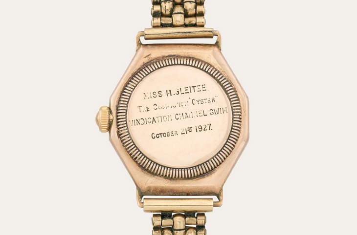▲將拍賣的蠔式手錶背面刻有"Miss M. Gleitze"、"Oyster"及1927年雪恥之游日期,彰顯歷史意義。Source:Sotheby's