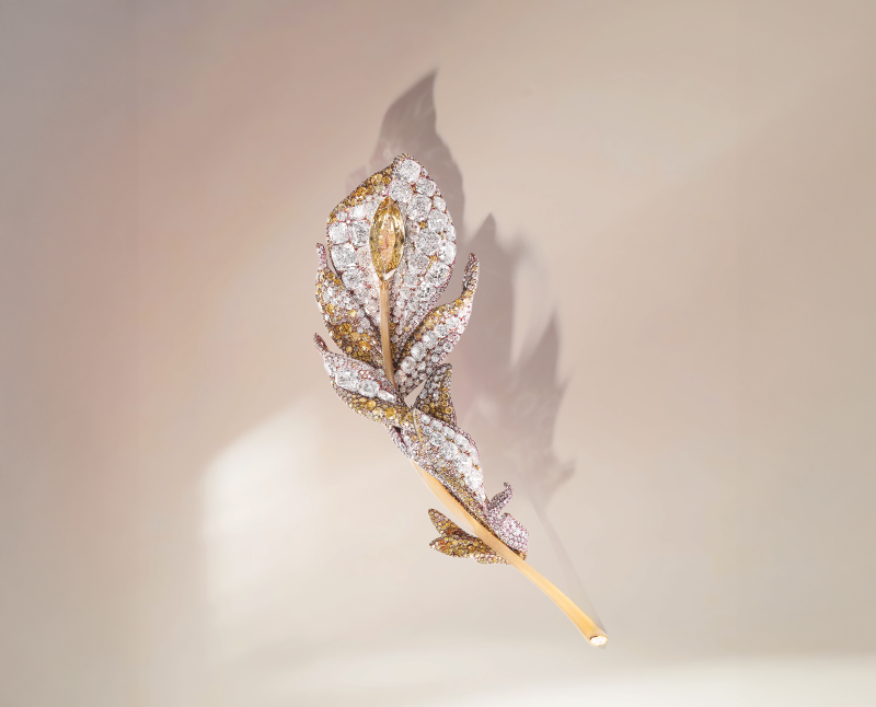 看似翠色的羽毛胸針,則使用了白鑽、黃鑽、沙弗萊石、藍寶石、翠榴石、灰藍色藍寶石、黃綠色藍寶石、變色石榴石,活用色彩的明暗漸層變化,塑造出栩栩如生的雕塑感。還有一件新作刻意採用牛角做為羽毛枝幹,鑲嵌白鑽、黃鑽、棕鑽,顏色近似卻帶有不同的質感,這種搭配,亦勾勒出氣質非凡的羽毛胸針。