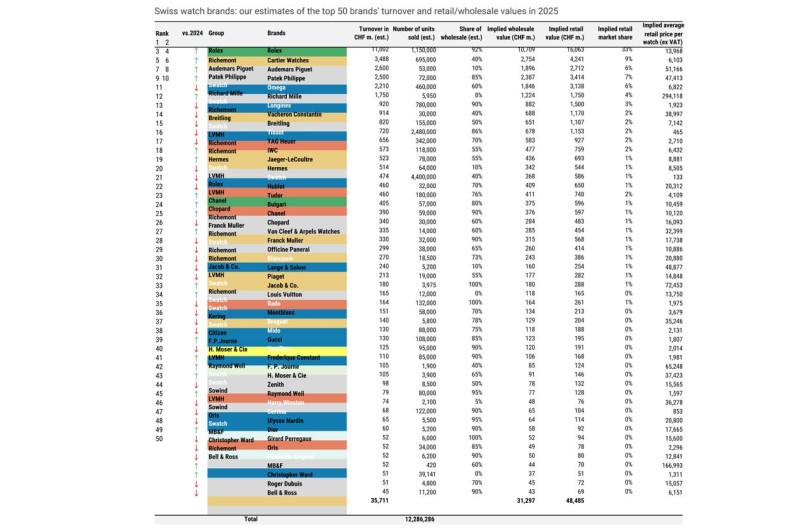 根據大摩Morgan Stanley與LuxeConsult發佈的年度瑞士鐘錶報告,JACOB & CO.成為2025年成長幅度最高的瑞士品牌,在前50大品牌普遍承壓的情況下,它以1.8億美金營收、14%年增率奪下銷售成長冠軍;銷量更達3975只,年增24%。這樣的數字,放在平均單錶零售價超過7萬瑞郎的定位來看,含金量極高。